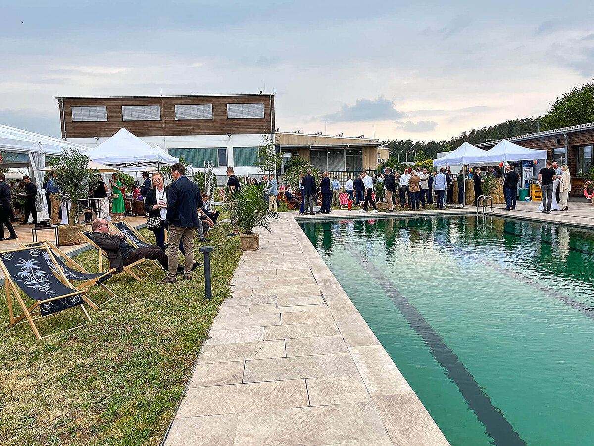 Den krönenden Abschluss bildete die Abendveranstaltung am Freitag: Ab 15 Uhr versammelten sich die ersten Gäste, um bei einem leckeren Drink und Snacks an der Poolbar oder in einer der gemütlichen Sitzecken ins Gespräch zu kommen. Wer das Werk näher erkunden wollte, konnte an einer exklusiven Werksführung teilnehmen oder die Umgebung vom Kranballon aus betrachten. Nach einer emotionalen Rede von unserer Geschäftsführerin, Frau Christiane Riefler-Karpa, war das Buffet eröffnet: Auf die Gäste warteten verschieden Pasta- und Fleischkreationen, Fisch aus der Region, Burger und eine Cocktailbar. Zur Unterhaltung trugen ein Zauberer und Schnellzeichner bei, während die mitreißende Stimmung der Live-Band und des DJs die Tanzfläche füllte. Ein unvergessliches Event, mit Emotionen und mit vielen neuen und altbekannten Gesichtern und Freunden.
