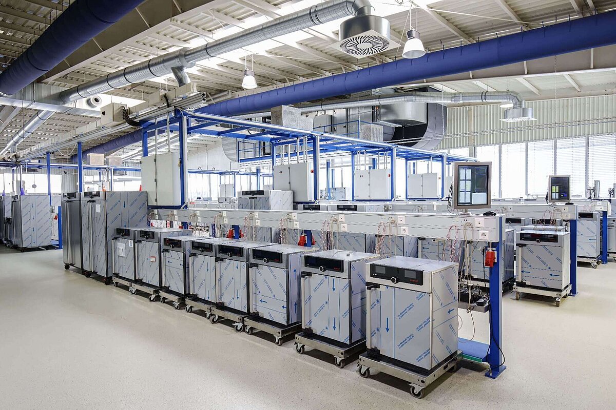 The Memmert test bay has a capacity of 540 places, in which every heating oven and every heating bath runs through a fixed routine for calibration and quality testing prior to final delivery.